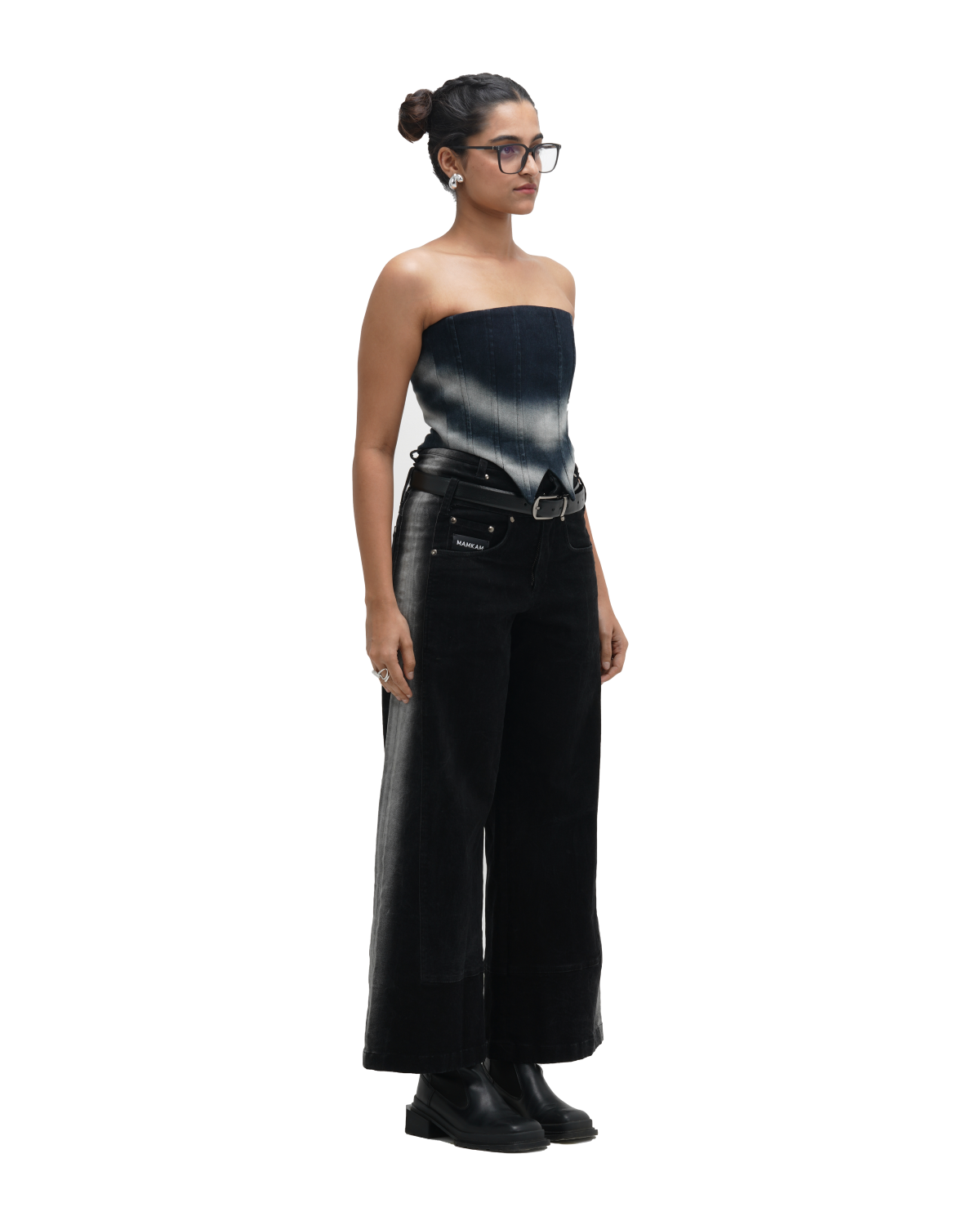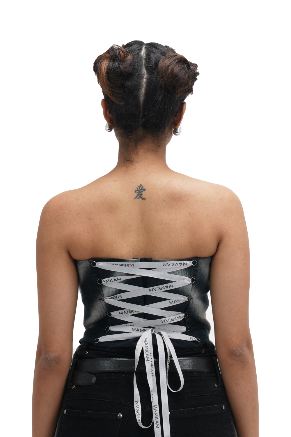 its dark wash finish. Structured boning through the front creates a sharp, architectural silhouette, while the lace-up back offers customizable cinching for a