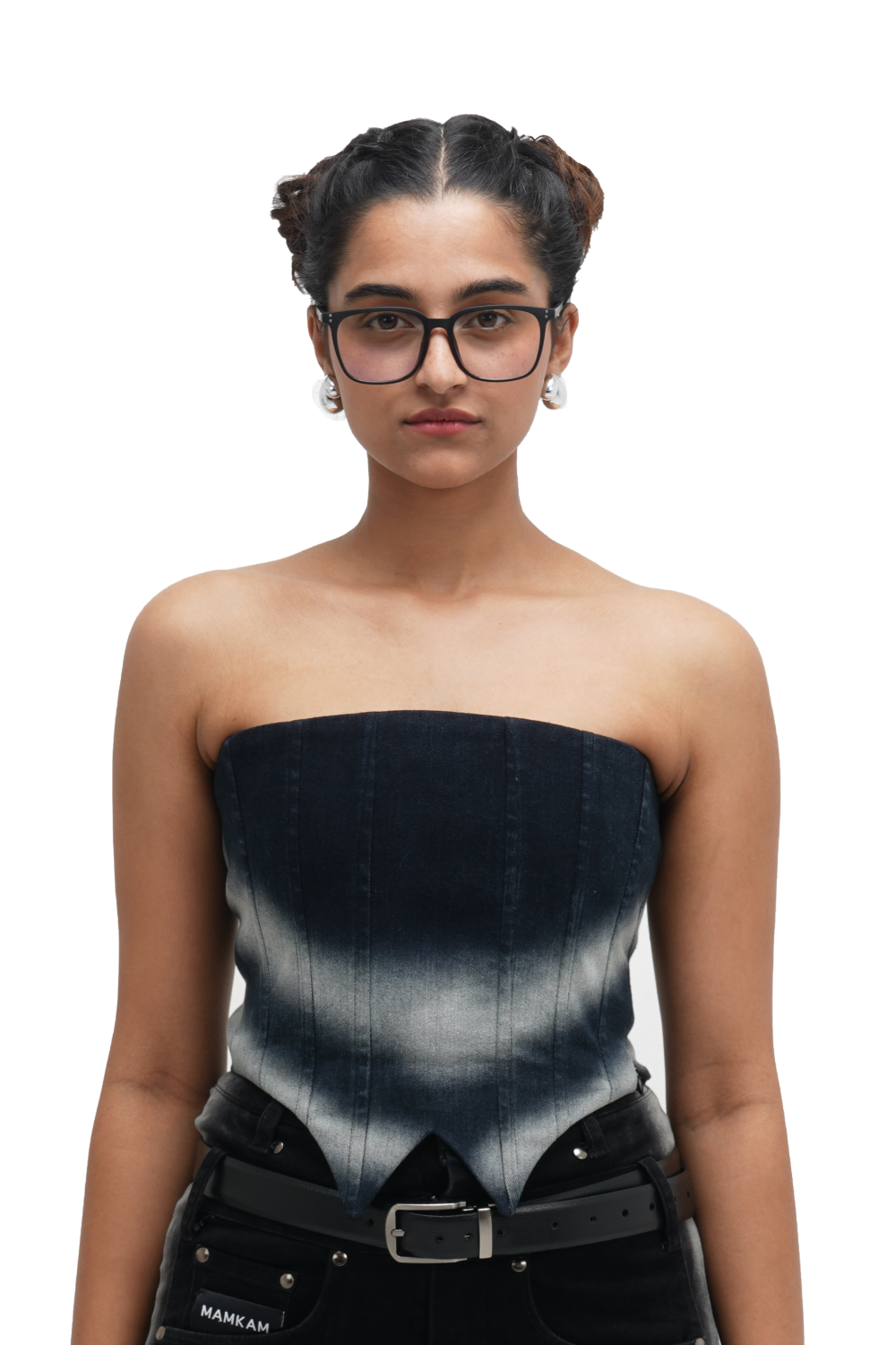 This sculpted corset redefines denim with a bold bleached gradient effect across