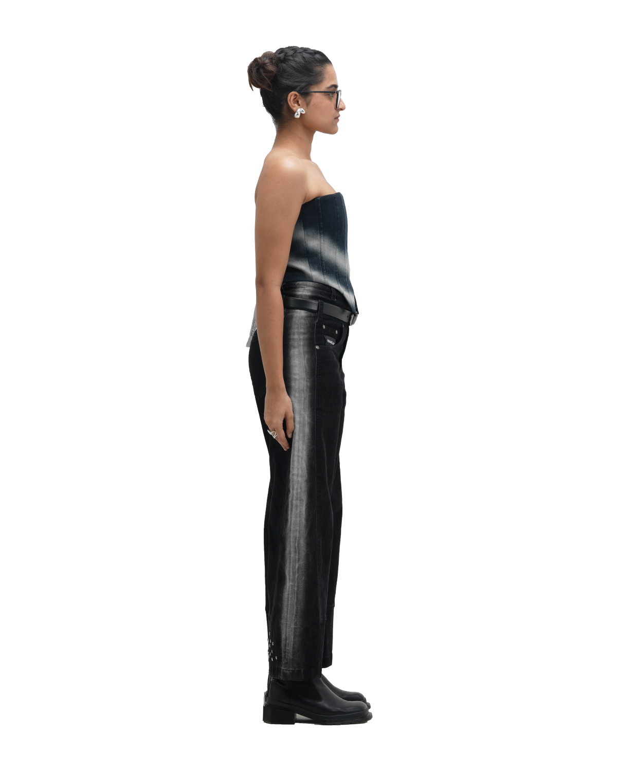 its dark wash finish. Structured boning through the front creates a sharp, architectural silhouette, while the lace-up back offers customizable cinching for a