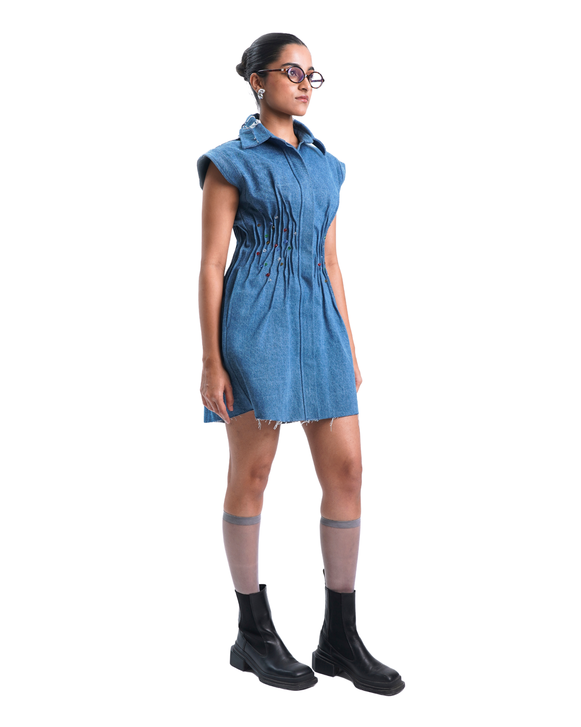 A raw-hemmed denim shirt-jacket dress designed to celebrate the beauty of imperfection. Featuring stitched crease details at the waist inspired by natural stretch marks and delicately adorned with crystal glass beads, this piece honors the body's unique story. The front includes a hidden placket for a clean, seamless finish, while subtle boning at the side seams of the lower half sculpts an hourglass silhouette.