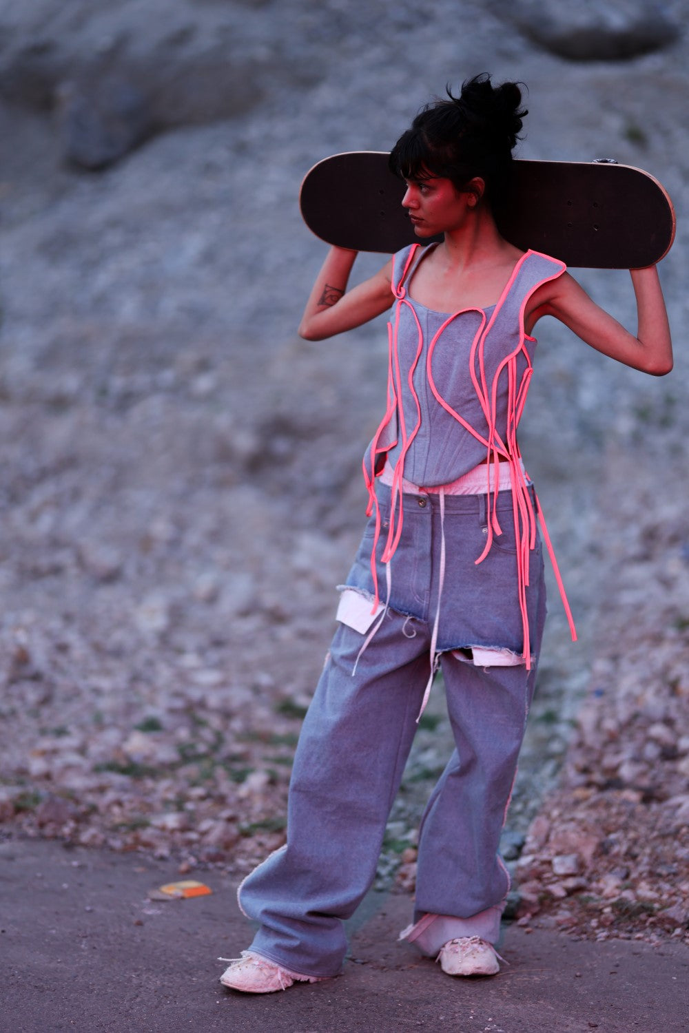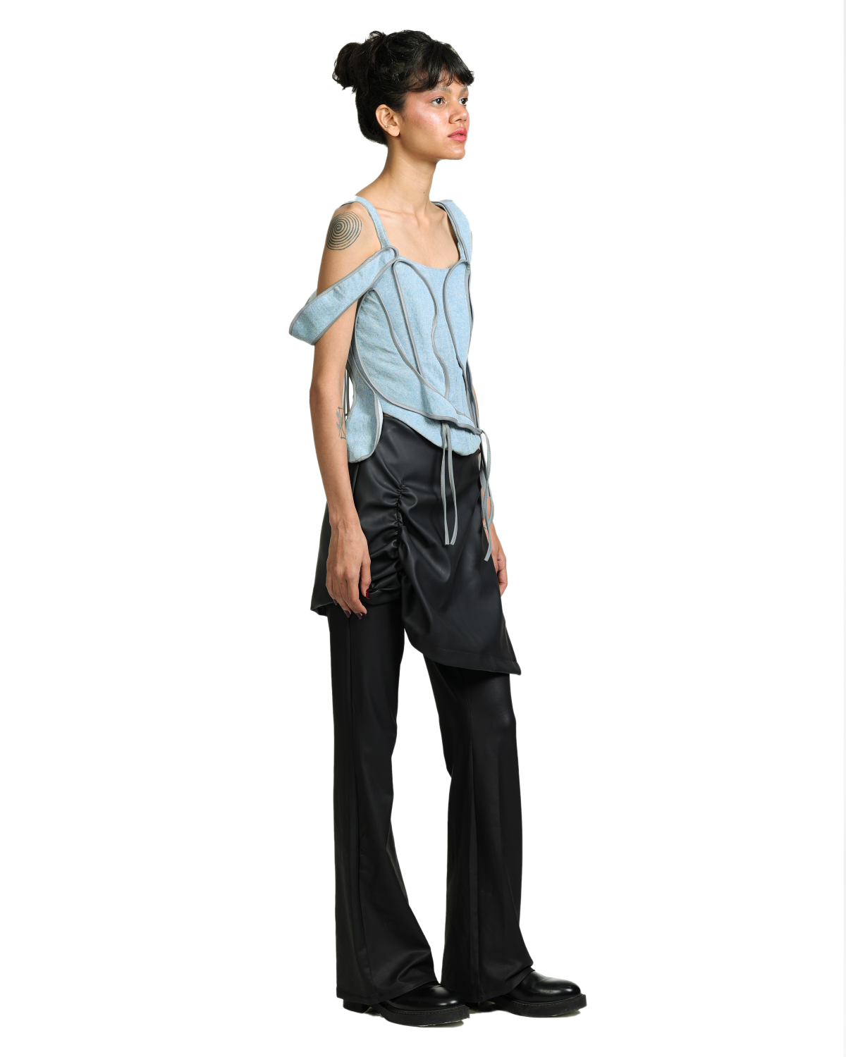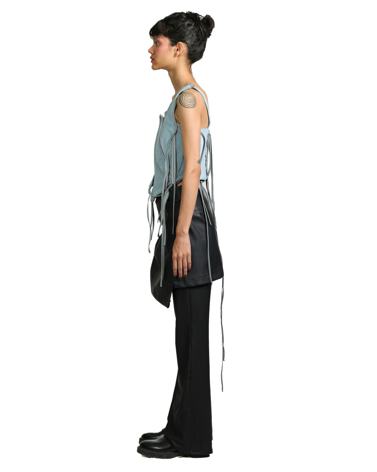 All-denim corset featuring shape-shuffle patches with reflective piping - snap a pic with flash to see it glow. Internal boning creates a cinched silhouette while the adjustable back tie ensures a perfect fit for your body contours.
