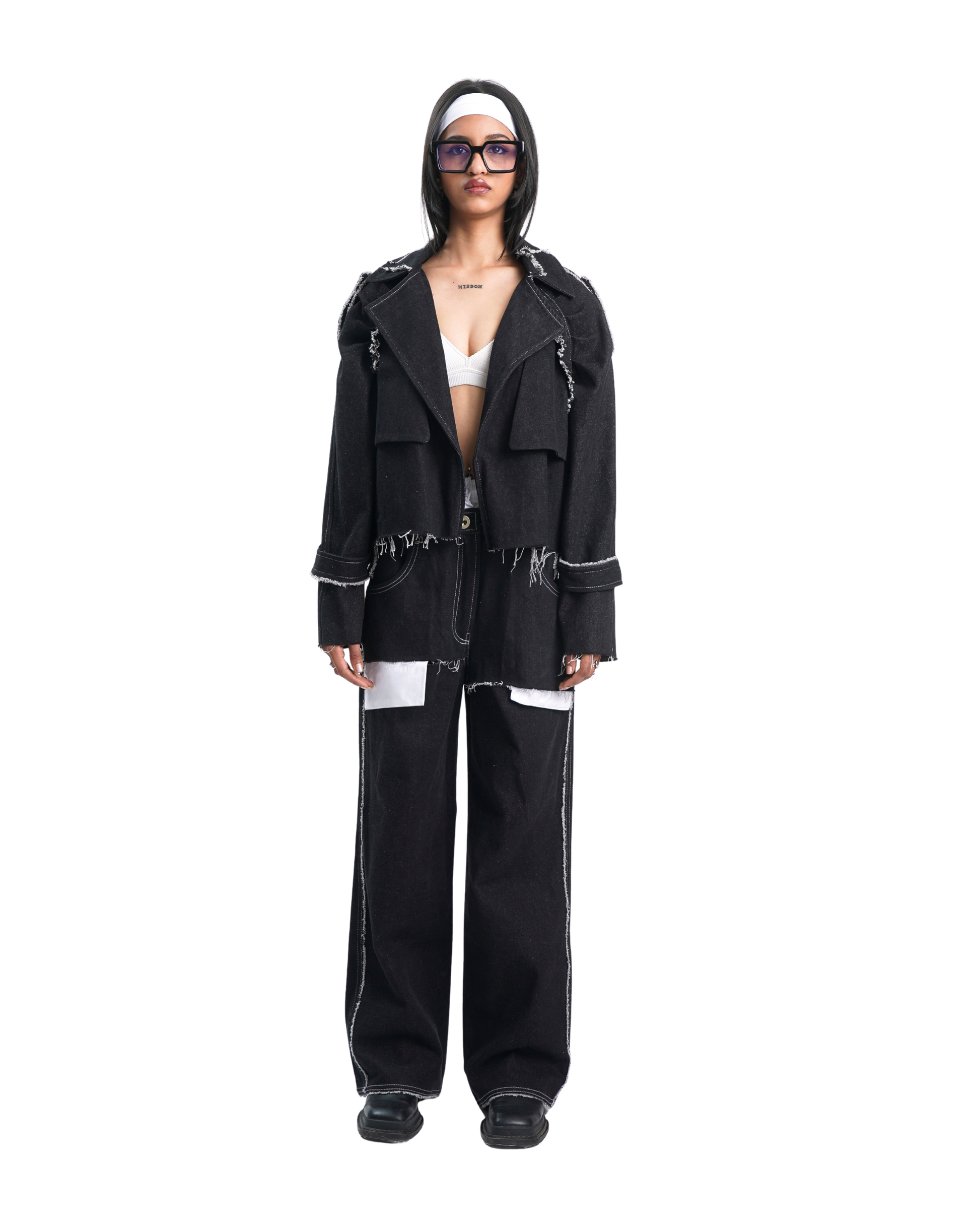 A new-age oversized statement piece featuring multiple denim layers, frayed detailing, and an unfinished hemline. Designed with voluminous raglan sleeves and a belted cuff.