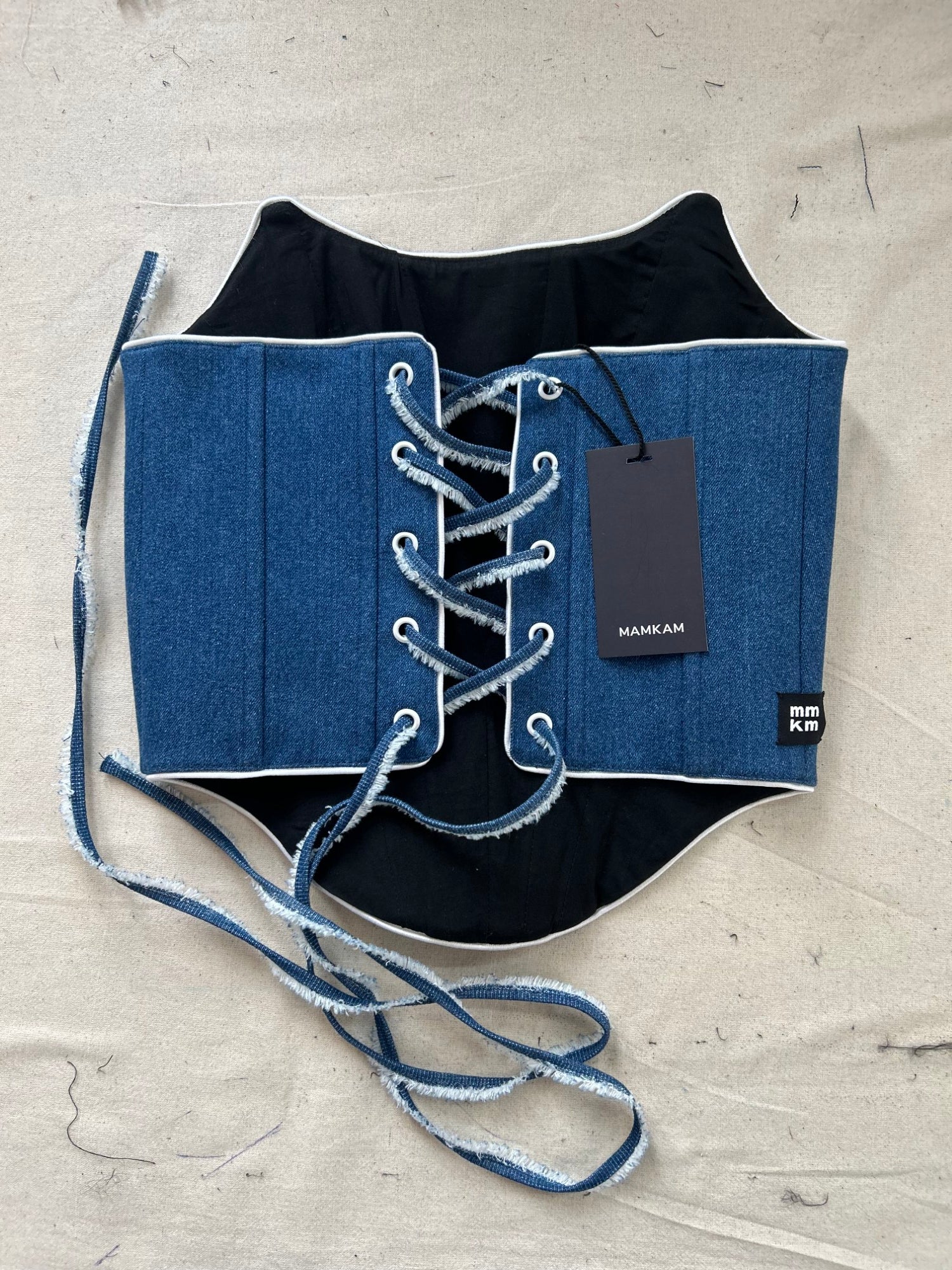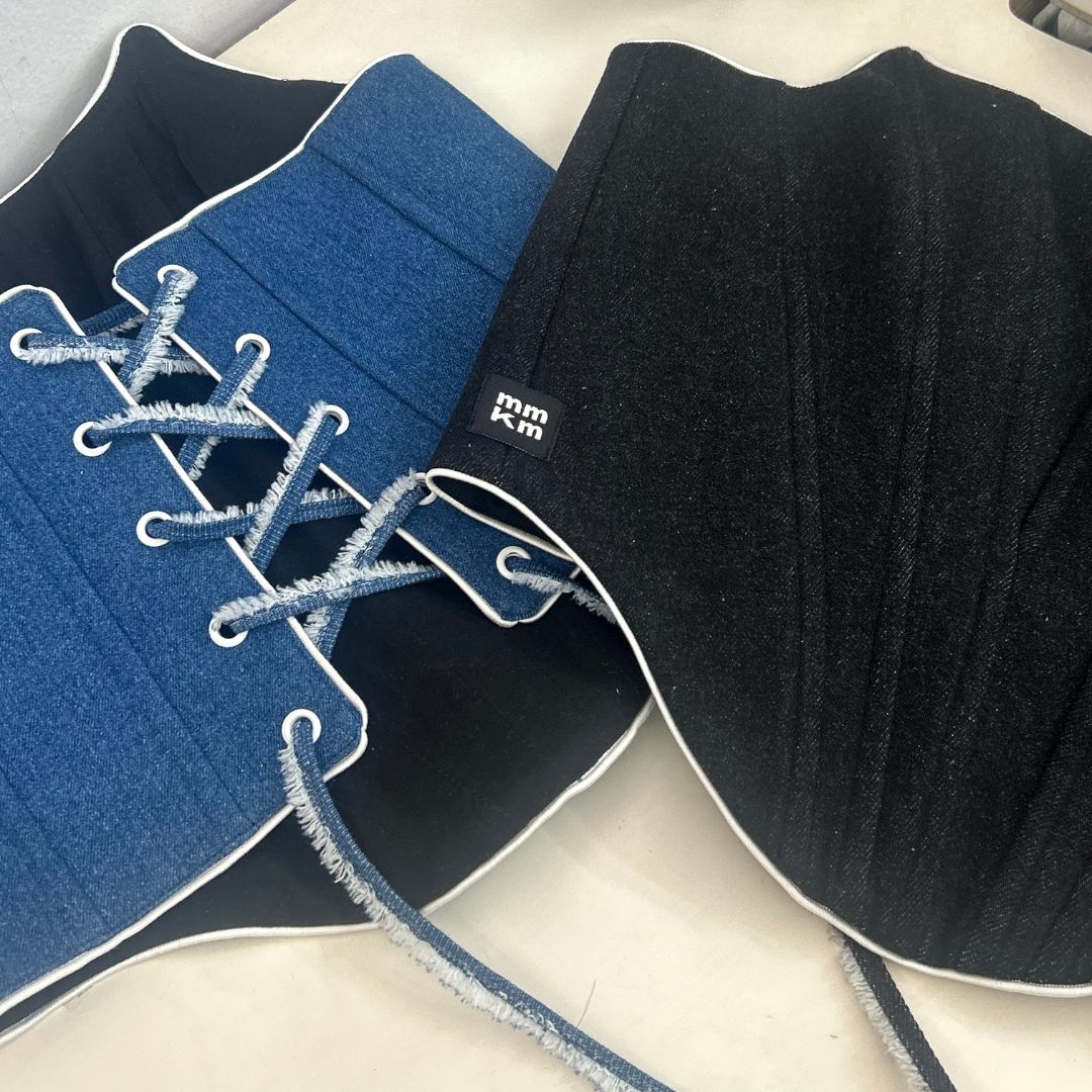 The strapless denim corset is crafted from 100% cotton denim for structured comfort, featuring contrasting white piping details. With its adjustable back tie closure and body-hugging silhouette, it sculpts the waist for a sleek, refined look while offering personalized fit control.