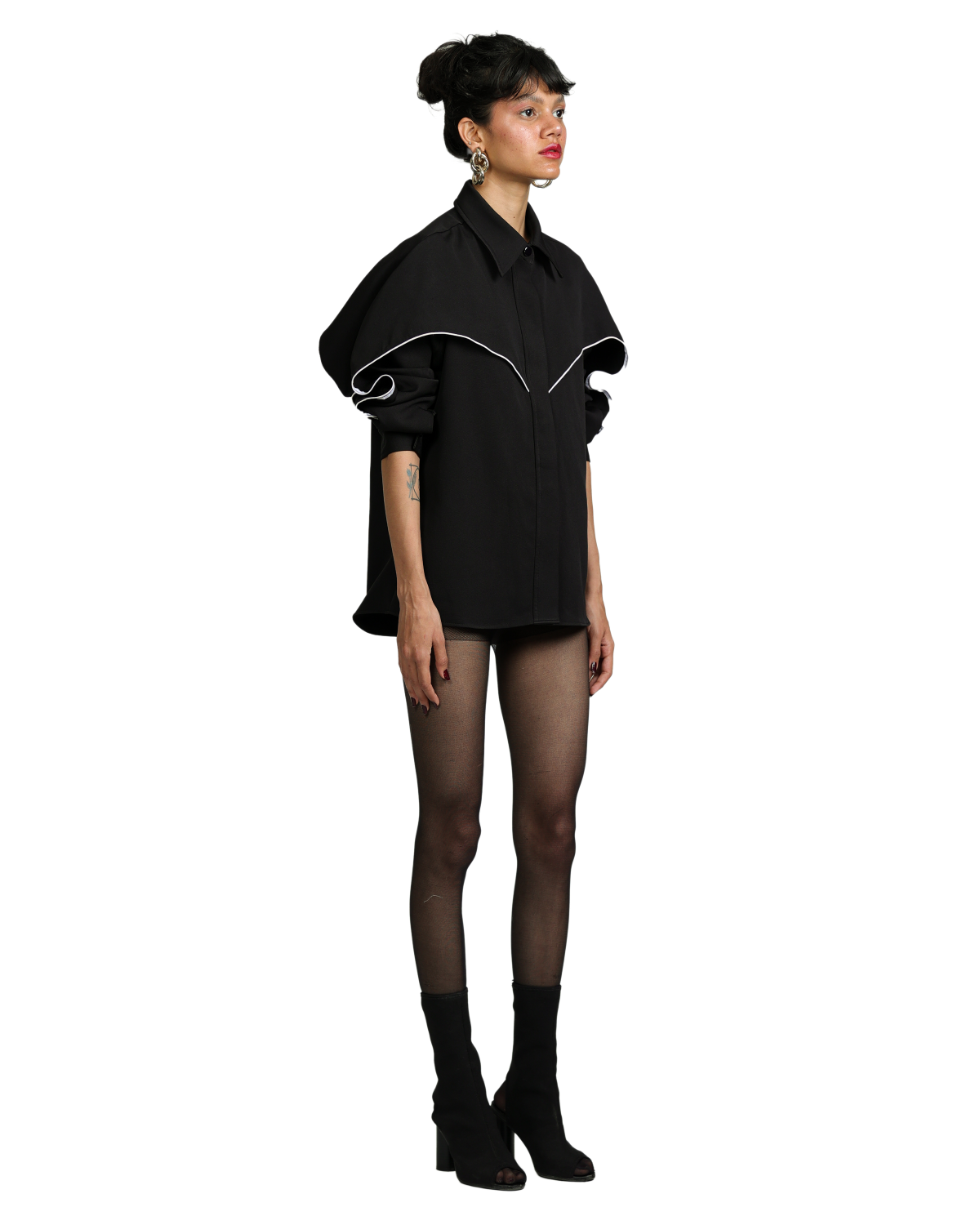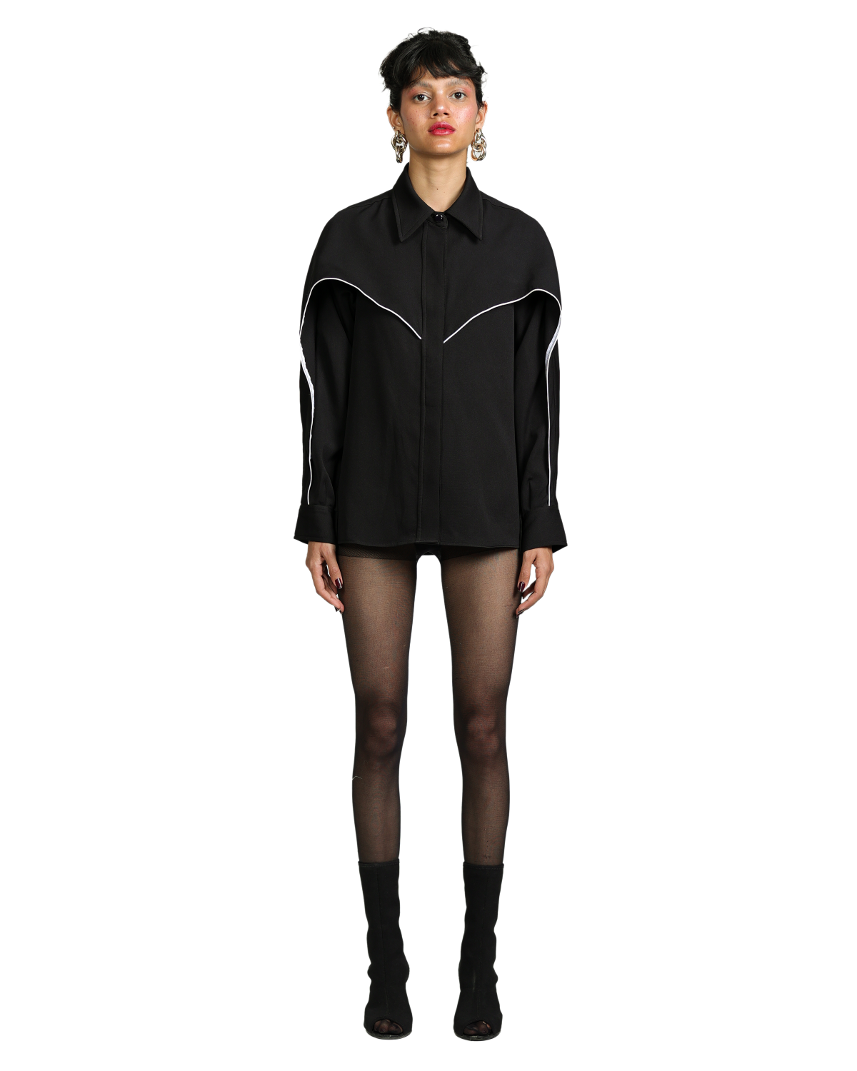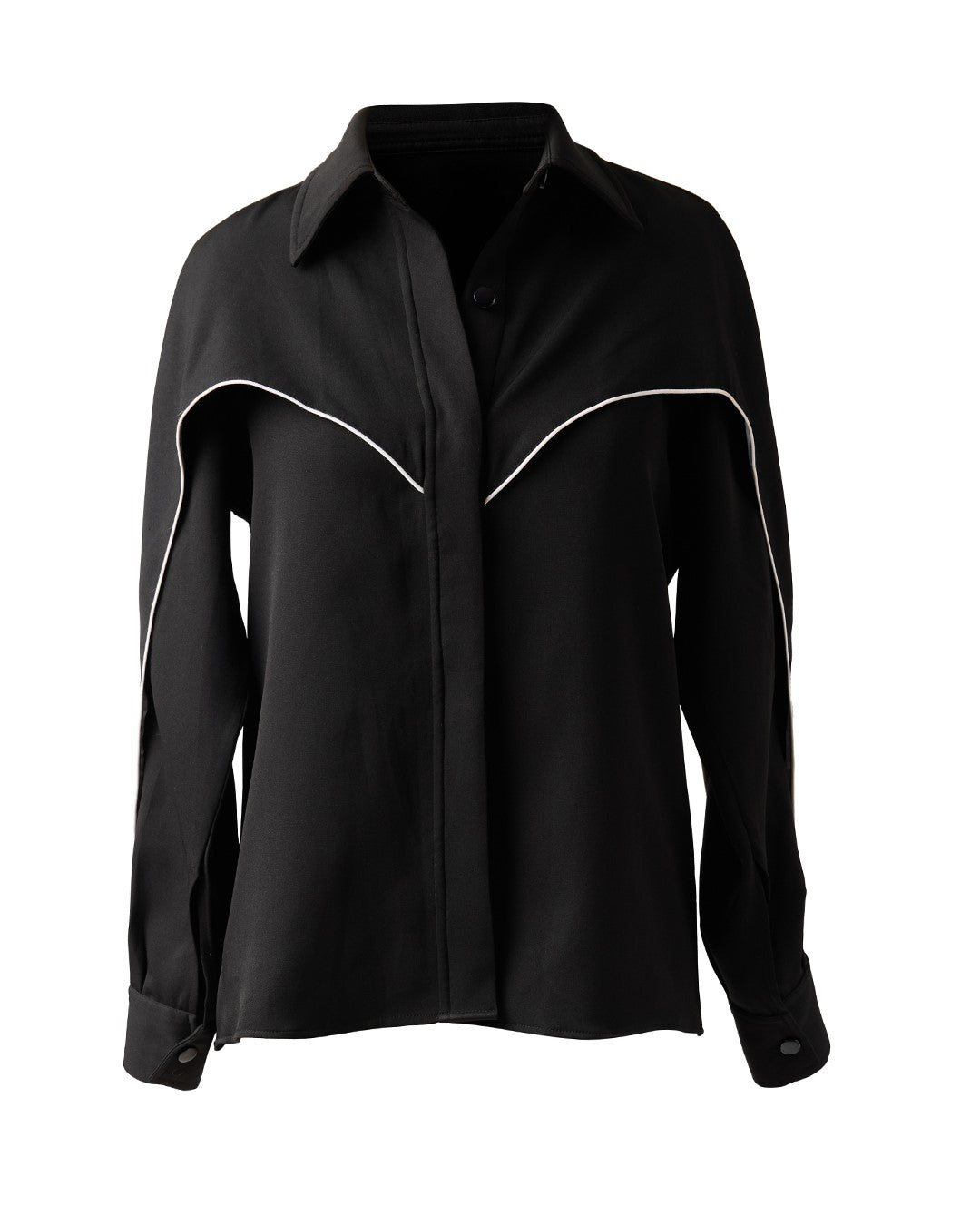 The Black Wing Shirt features a sleek hidden front placket with striking white piping that creates an illusion of wings in motion. Designed with an oversized silhouette for effortless styling with both pants and skirts.