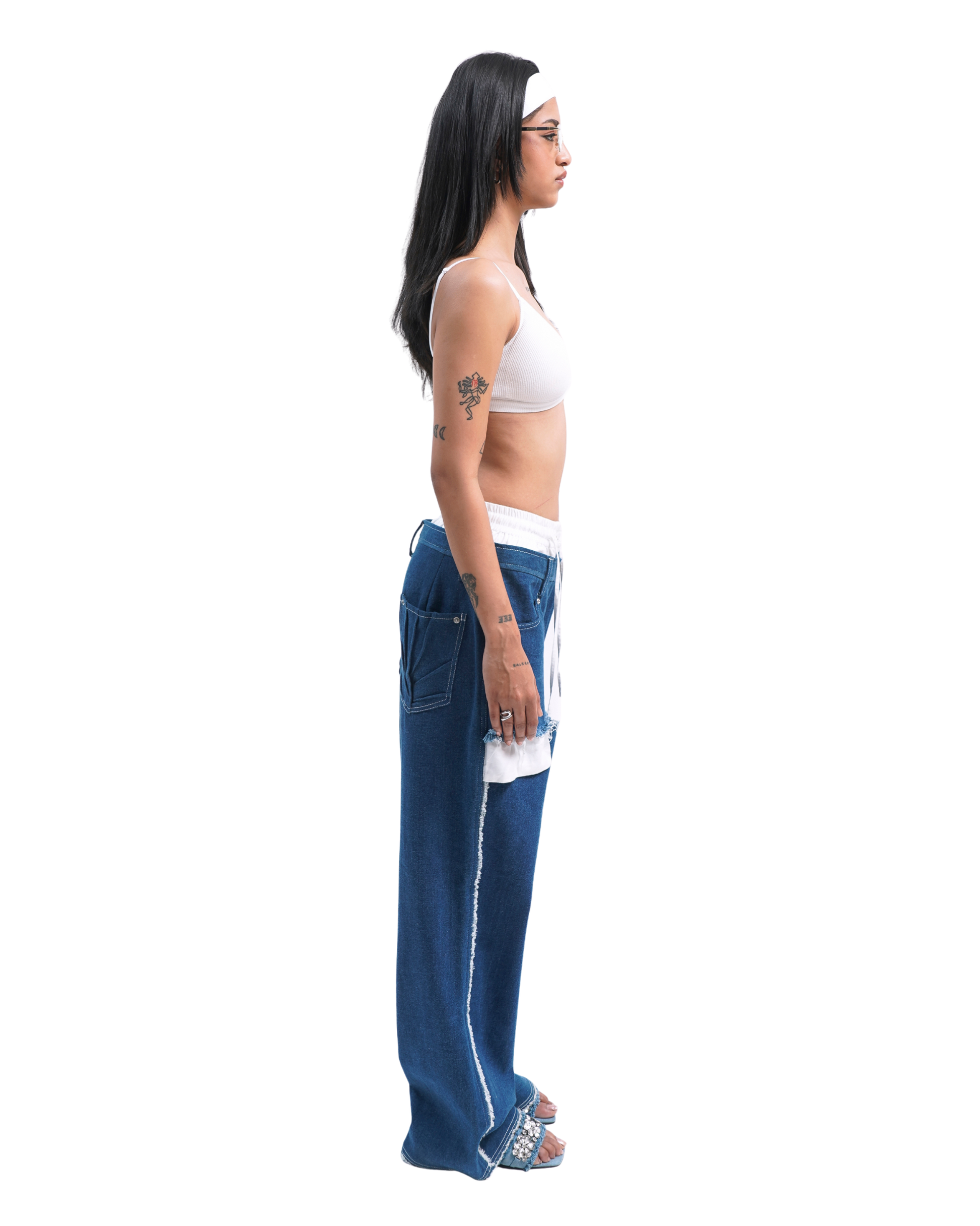 New Age Baggy Denim Pants blend streetwear edge with comfort, featuring a sweatpant-inspired waistband and deconstructed pocket detailing. The intentionally exposed pocket bags and back pocket creases (inspired by natural stretch marks) create an avant-garde take on classic denim.
