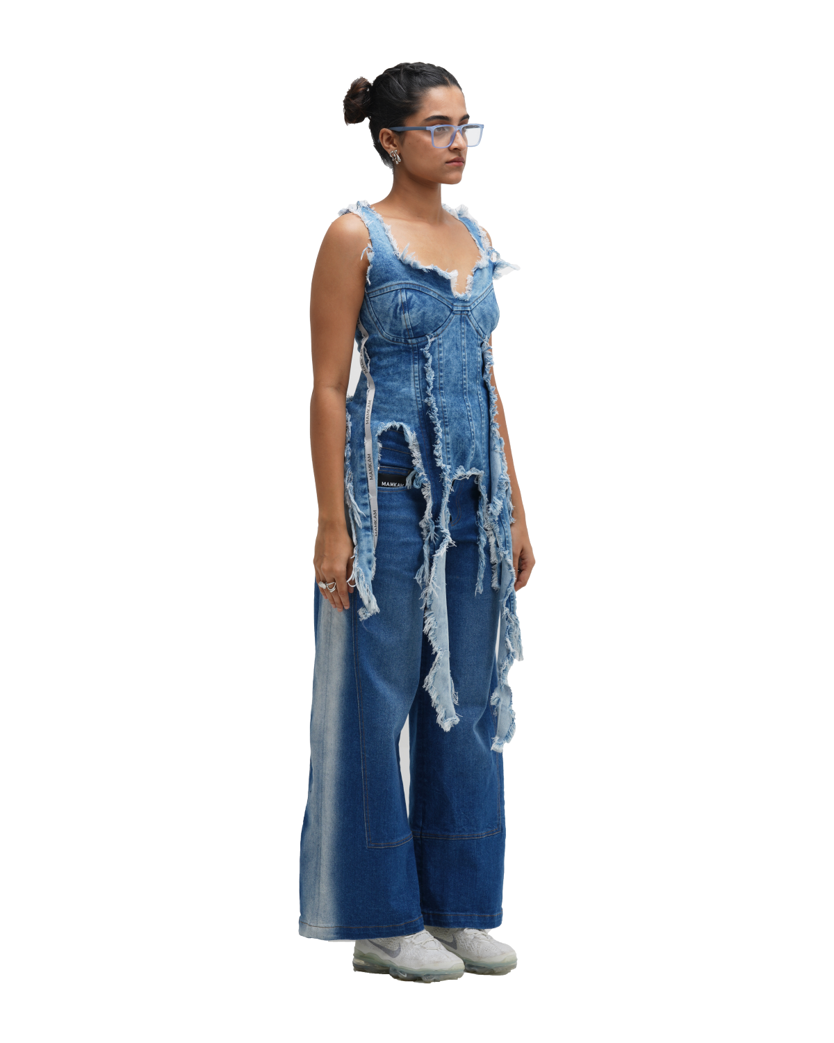 This washed denim corset stands out with its uneven hemline, heavy fraying, and